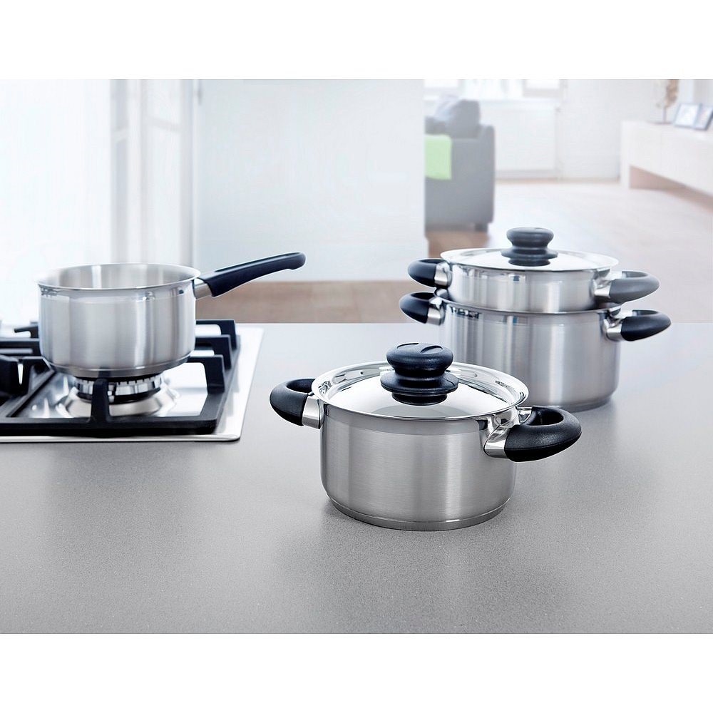 Karaat+ pannenset 4-delig een klassieker in het BK assortiment, maar daarmee ook degelijk en betrouwbaar, zo zou je deze Karaat+ pannenserie kunnen omschrijven. Het contrast van een geborsteld roestvrijstalen body met een hoogglans gepolijste deksel valt direct op. BK Karaat+ pannen hebben daarnaast stevige kunststof koudgrepen die de pannen veilig hanteerbaar maken tijdens het koken. De schenkrand is zo ontworpen om makkelijker uit te schenken zonder morsen. Na gebruik is de BK Karaat+ kookpan zo in de vaatwasmachine te reinigen, en zijn verschillende pannen stapelbaar om ruimte te besparen. Met deze 4-delige BK Karaat+ pannenset haal je een complete basisuitrusting in huis waarmee je direct aan de slag kunt.
