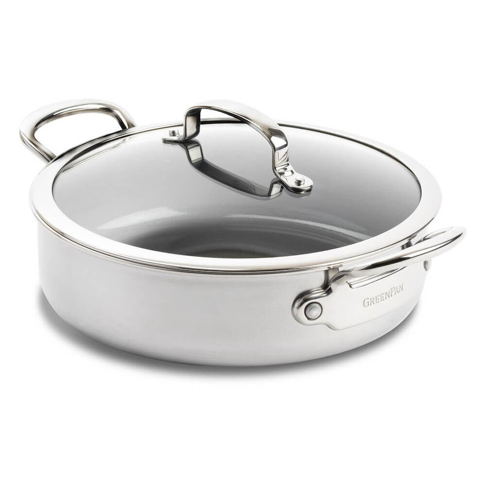 Met deze prachtige hapjespan uit de Premiere collectie van Greenpan til je je kookkunsten moeiteloos naar een hoger niveau! De pan heeft een tri-ply bodem en deze bestaat uit twee roestvrijstalen lagen met daartussen een aluminium kern, die voor indrukwekkende kook- en bakresultaten zorgt. Dankzij de Evershine technologie blijft het roestvrij staal er als nieuw uitzien. Bovendien zorgt het voor een optimale warmteverdeling tot bovenaan de rand van de pan. De hapjespan heeft een diameter van 26 cm, is 7,5 cm hoog en heeft een inhoud van ongeveer 3,8 liter.