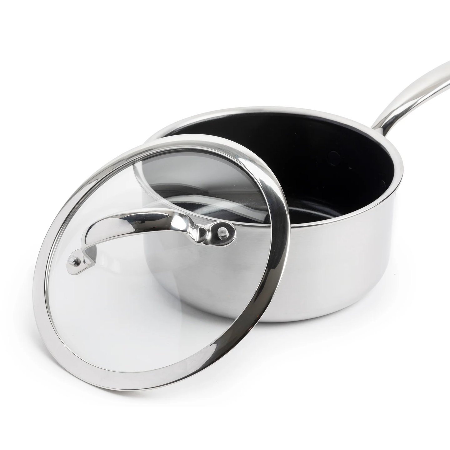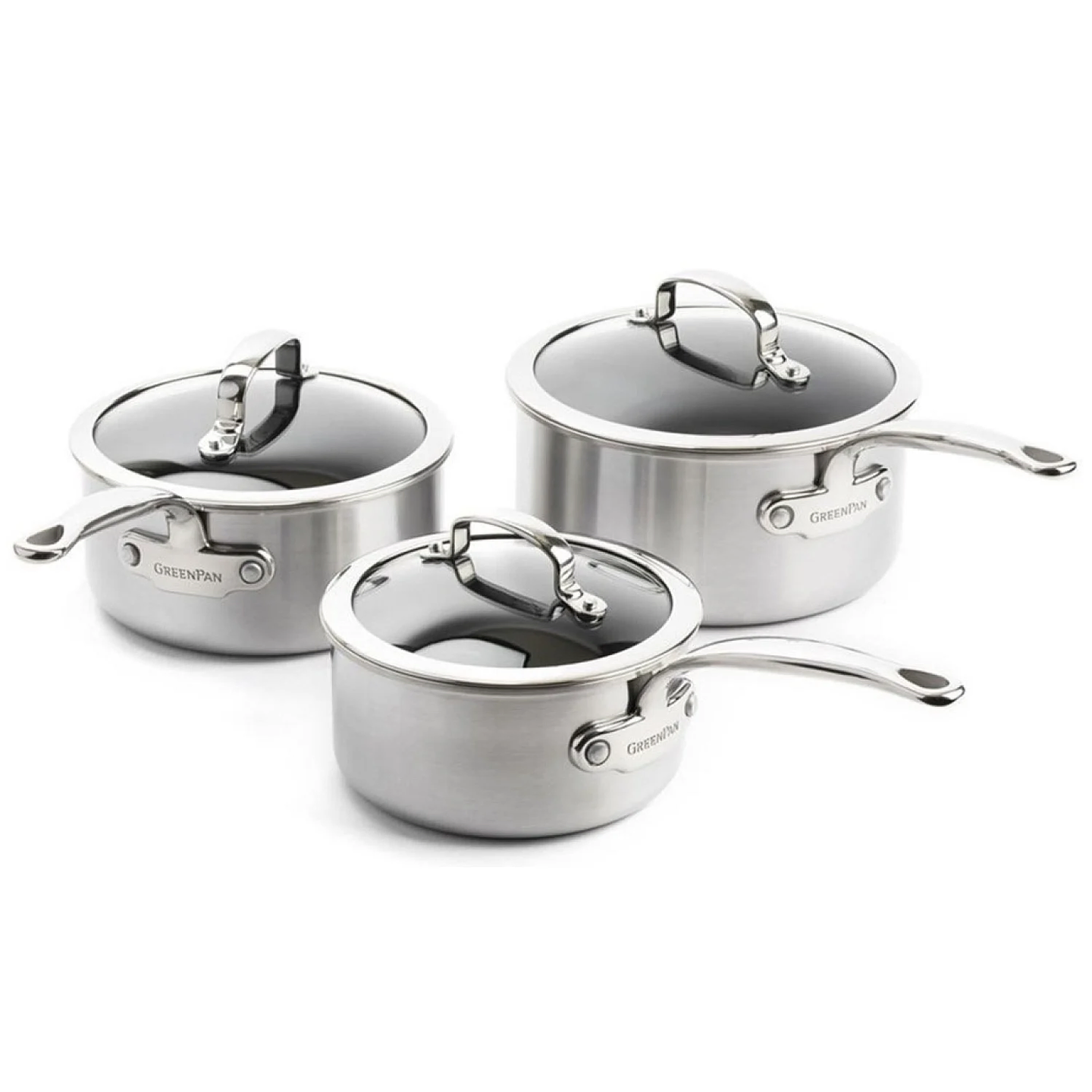 Ontdek de grenzeloze mogelijkheden van de innovatieve Premiere collectie van GreenPan. Deze steelpannenset hebben de maten van 16 cm - 18 cm en 20 cm en dit zijn populaire maten. De inhoud van deze sauspannen hebben zijn 1,5 - 2,1 en 3,1 liter en zijn erg handig voor het koken en het bereiden van de lekkerste sauzen. Bereid je voor om je kookervaring naar nieuwe hoogten te tillen! Met een prachtig design en vervaardigd uit professioneel 3-laags roestvrij staal, levert deze Greenpan collectie indrukwekkende kook- en bakresultaten. De Premiere pannen kunnen gebruikt worden op alle gangbare warmtebronnen en mag zelfs in de oven. De steelpannen zijn vaatwasserbestendig, maar om ze in goede conditie te houden raden wij toch handafwas aan!