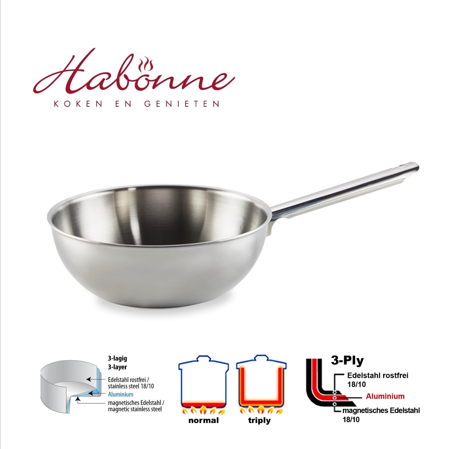 Deze prachtige roestvrijstalen steelwok is vervaardigd van het zeer duurzame meerlagenmateriaal 'Triply'. Binnen en buitenzijde zijn gemaakt van 18/10 roestvrijstaal met daartussen (de kern) een laag van aluminium. Eén van deze roestvrijstaal is magnetisch gemaakt, hierdoor is deze Habonne wokpan zeer geschikt voor inductie kookplaten. Door de mooie ronde vorm met doorlopende bodem en de samenstelling van het materiaal ontstaat een perfecte warmteverdeling, met een snellere opwarming tot aan de bovenste rand van de wok. Ook blijven uw gerechten langer warm in deze wok. Bovendien heeft dit materiaal een energiebesparend effect. De wok is geschikt voor alle warmtebronnen inclusief inductie, vaatwasmachinebestendig en ovenvast.