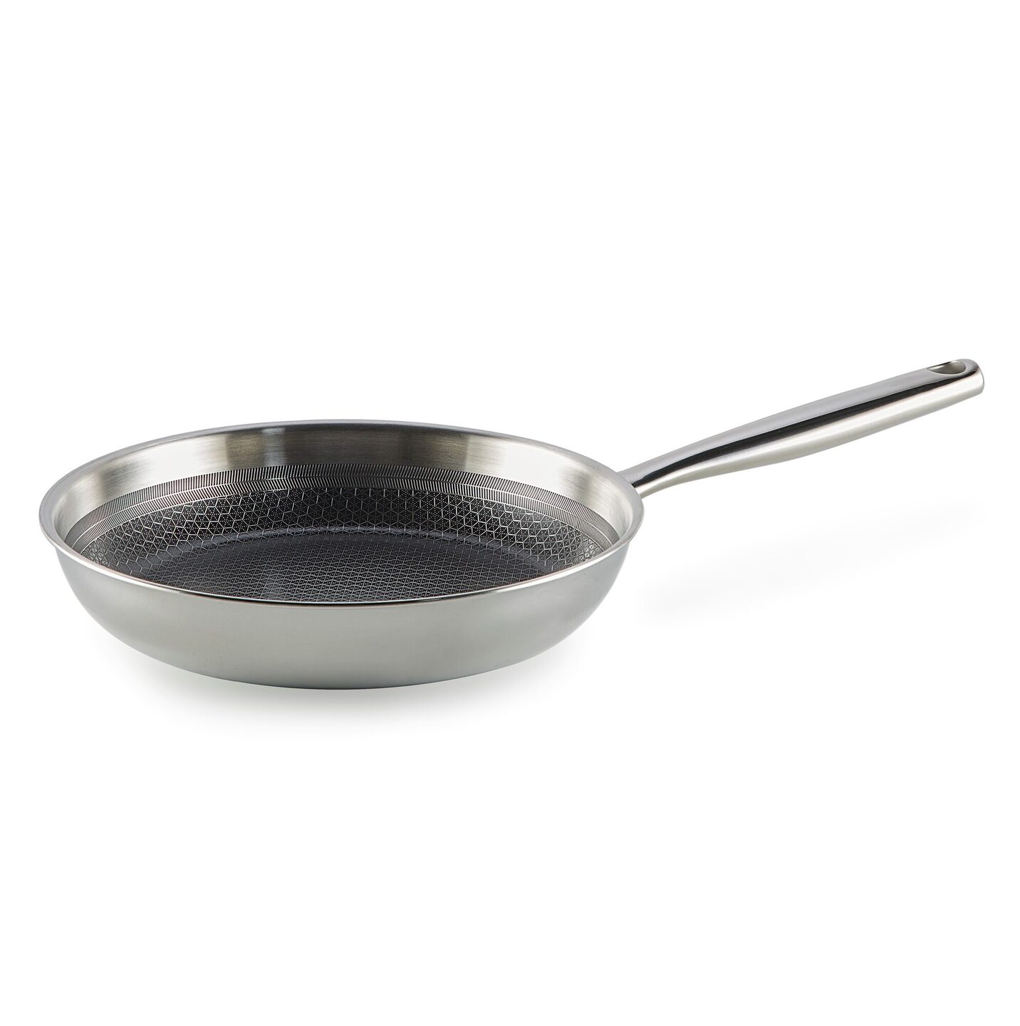 Het unieke honinggraatmotief van roestvrij staal beschermt de antiaanbaklaag tegen krassen, waardoor je zelfs met metalen spatels kunt werken. Dit patroon zorgt daarnaast voor een perfecte verdeling van olie en warmte, zodat je gerechten niet snel aanbakken. Of je nu een omelet, gebakken aardappelen, kip of een stuk vlees bereidt, met deze pan krijg je altijd een mooi bruin en krokant resultaat. De stevige gepuntlaste steel blijft koel op inductie en is hygiënisch doordat er geen vuil kan ophopen.
