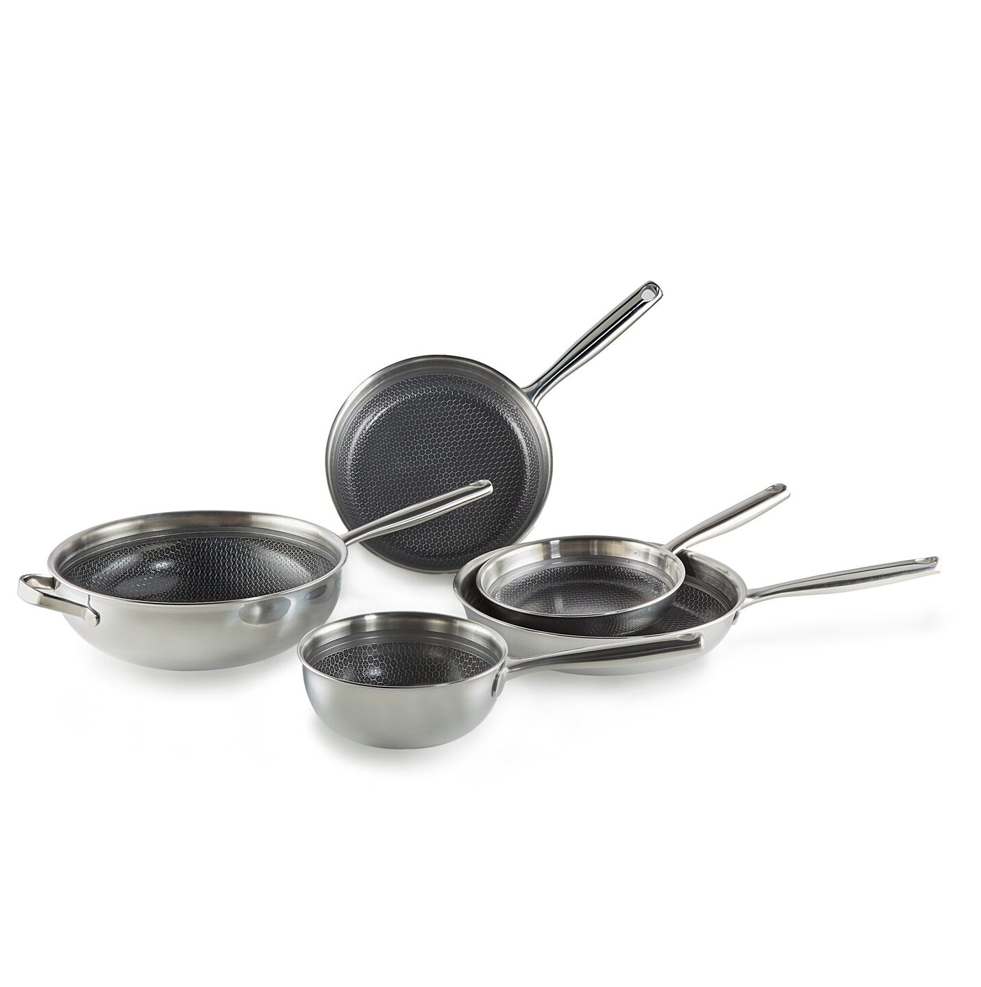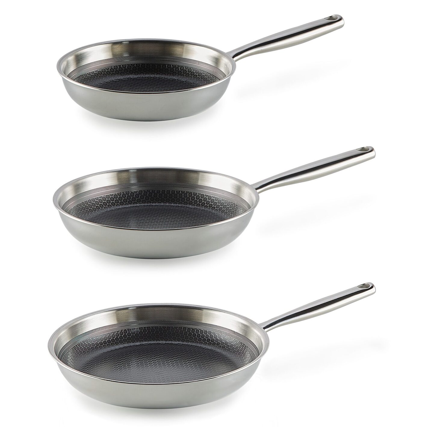 Het innovatieve honinggraatmotief beschermt de antiaanbaklaag tegen krassen en zorgt voor een gelijkmatige verdeling van olie en warmte. Hierdoor blijft voedsel minder snel kleven en bak je vlees, kip of aardappelen extra krokant en mooi bruin. De set biedt je eigenlijk alle drie de ideale maten: 20 cm voor kleinere gerechten en 24 cm voor de wat grotere porties en de 28 cm voor het echt grote werk zo heb je altijd de juiste pan bij de hand. De gepuntlaste steel maakt de pannen hygiënisch en gemakkelijk schoon te houden, zonder lastige naden waar vuil in kan ophopen.