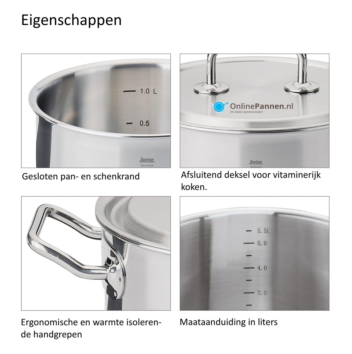 Dit alles zorgt ervoor dat de Spring Brigade Premium pannen een prima warmtegeleiding hebben tot aan de bovenste rand van de pan. De pannen zijn geschikt voor elke warmtebron, inclusief inductie. De Spring Brigade pannenserie mogen ook gebruikt worden in de oven, u kunt zo uw gerechten probleemloos, langzaam en smaakvol laten garen. De Brigade Premium serie is ontwikkeld voor en door connaisseurs en experts op kookgebied het is de perfecte combinatie tussen functionaliteit en Zwitsers design.