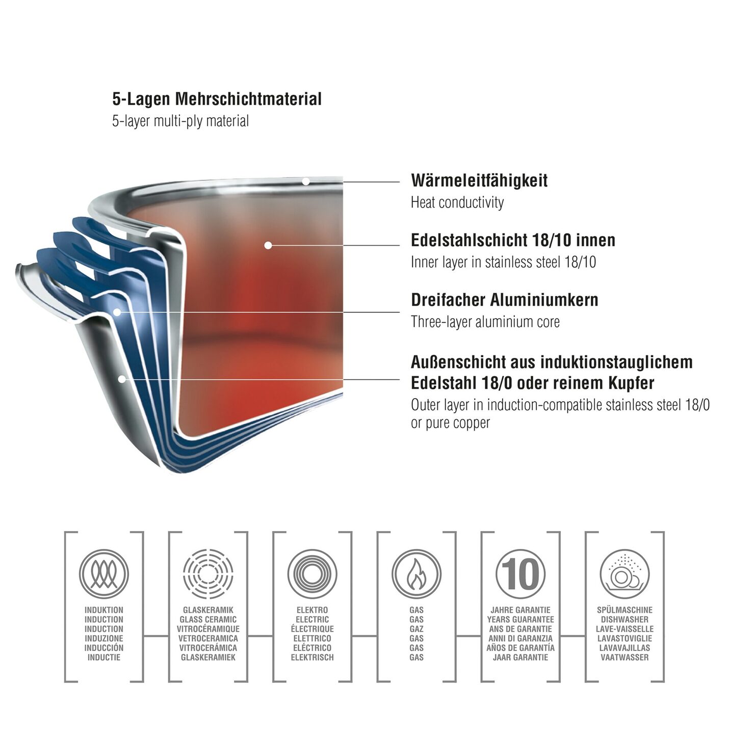 Het Zwitserse merk Spring maakt al ruim 30 jaar de mooiste pannen welke veelal gekenmerkt worden door hun 5-laags sandwichbodem constructie. De buitenste laag van de Spring Cristal GLI pannen is gemaakt van inductie geschikt roestvrij staal. De binnenlaag is eveneens gemaakt van roestvrij staal en daartussen zit een 3-laags aluminium kern voor de optimale geleiding.
