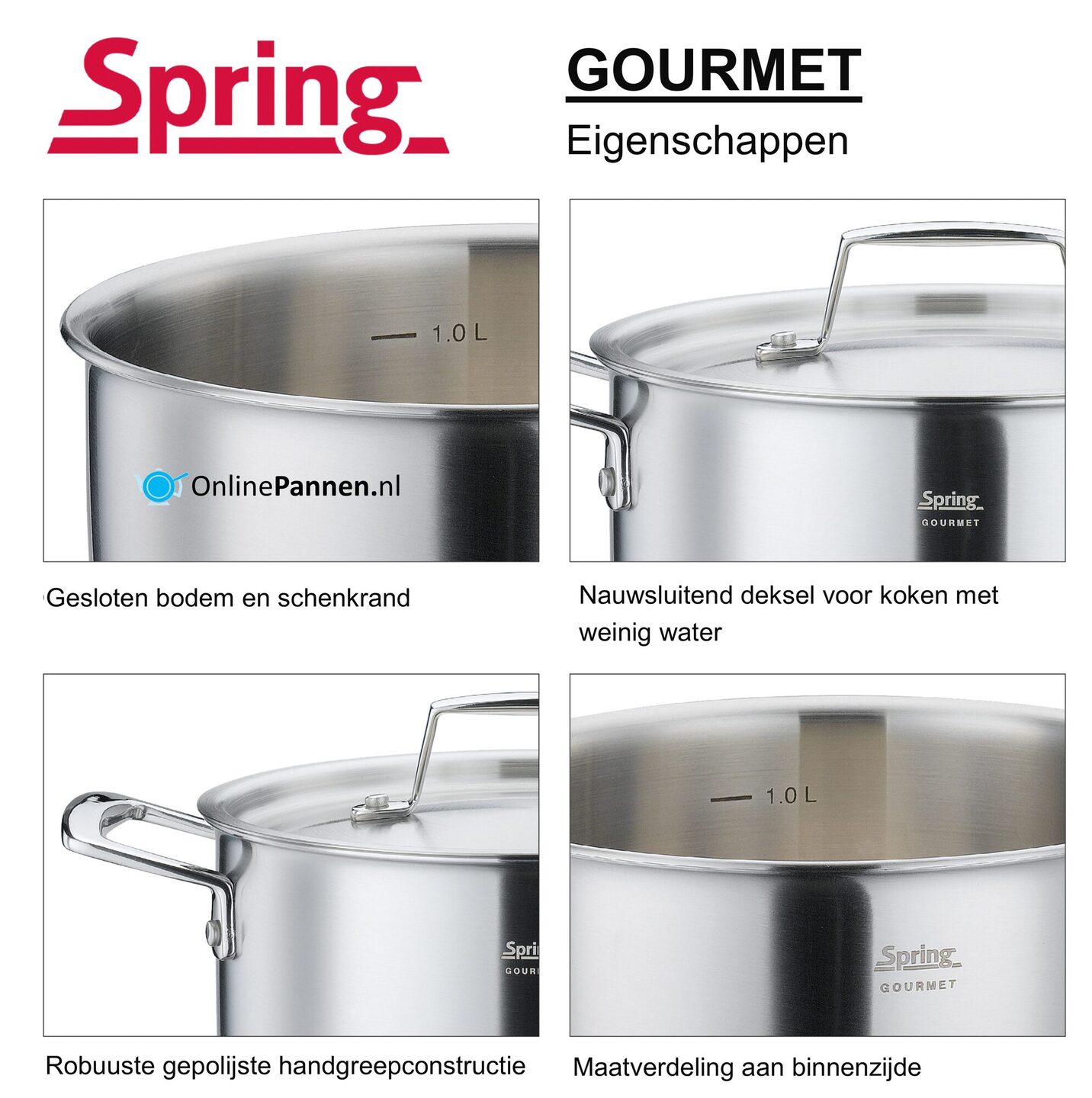 De mat geborstelde Spring Gourmet pannenserie combineert verfijnd design met indrukwekkende prestaties. Het beproefde 5-lagenmateriaal zorgt voor een snelle temperatuurreactie en een optimale warmteoverdracht van bodem tot rand. Daardoor worden je gerechten gelijkmatig en rondom verhit, ideaal voor energiezuinig en gecontroleerd koken. De Gourmet pannen zijn geschikt voor alle soorten fornuizen en voelt zich net zo thuis in jouw keuken als in de professionele gastronomie. Dankzij de gesloten bodem, randen en praktische schenkrand werk je schoon en nauwkeurig, zonder morsen.