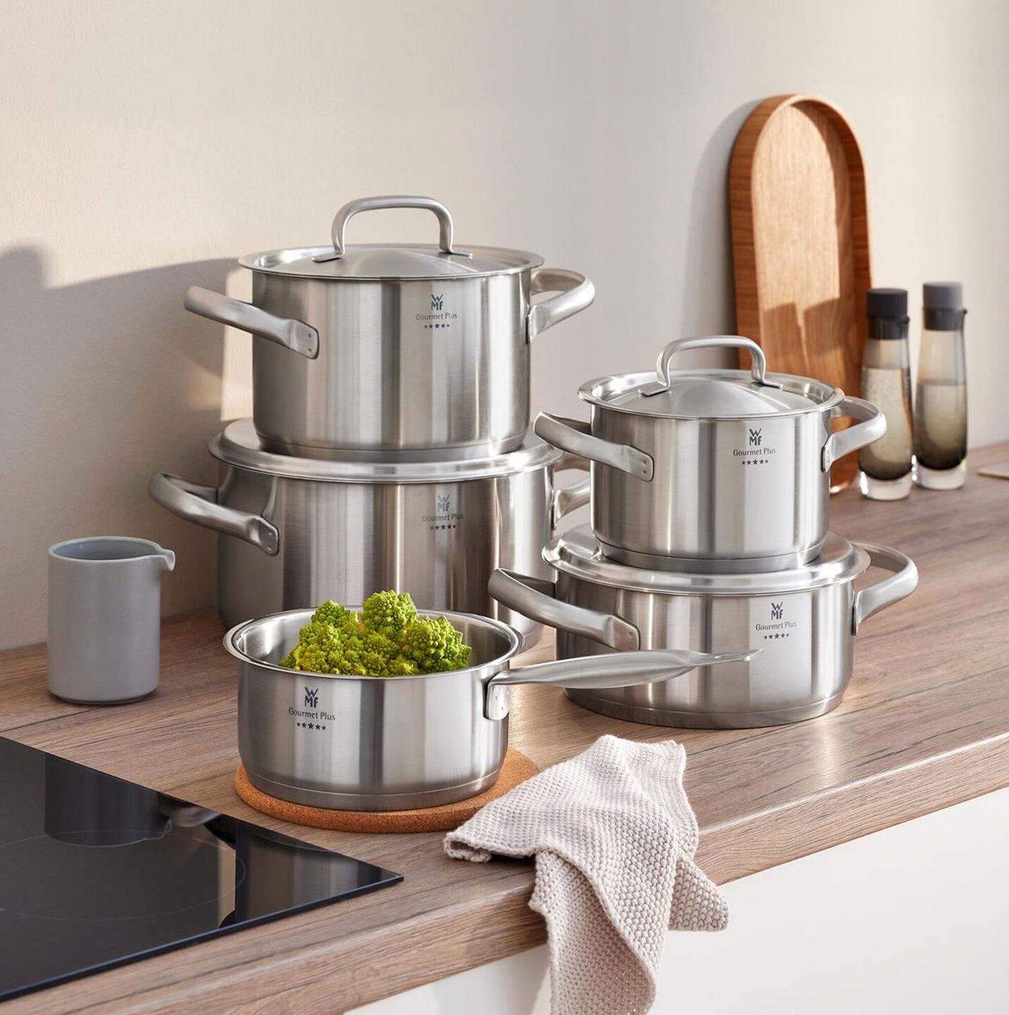 Gourmet Plus Gourmet Plus is zeer functioneel en voldoet ook aan de hoogste eisen van de professionele keuken. De serie bevat pannen en steelpannen in verschillende hoogtes en diameters, twee braadpannen en een serveerpan met en ruime diameter van 28 cm. Het is een zware serie die stabiel en bijna onverwoestbaar is.
