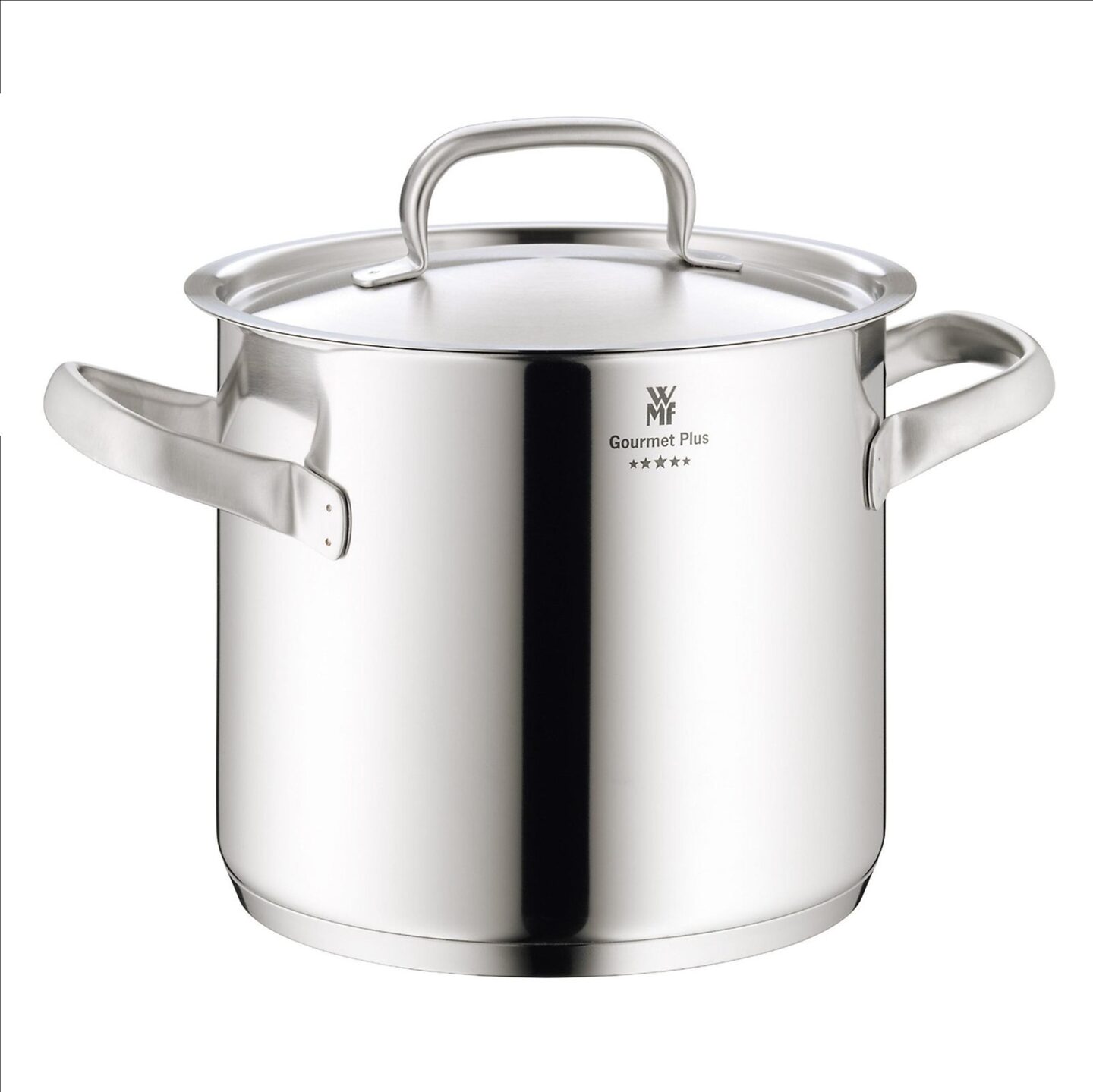 De bijzonderheden van de WMF Gourmet Plus: hoogwaardige, hermetisch afgesloten handvatten die op elektrisch koken niet heet worden. Een zware deksel die stevig op de pan ligt en voorzien is van een ventiel zodat er geen vacuüm kan ontstaan. Maataanduiding aan de binnenkant, evenals een extra brede gepolijste pannenrand voor lekvrij afgieten. Aan de buitenkant voorzien van WMF kwaliteit logo en serienaam.